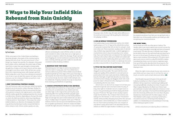 How it rains can also have an impact in how fast your field will recuperate and come back online for play . A long , slow , light to moderate rain of a couple hours or more is very penetrating and will be deeply absorbed by your infield soil . This type of rain usually requires longer for the field to dry . Compare that to heavy rain lasting 15 to 30 minutes , or even an hour . This kind of rainfall , while possibly dumping many times the amount of water than a slow rainfall did , is a violent rainfall to the soil . That violent pounding of the soil compacts it and doesn ’ t easily allow water to be absorbed into the infield soil . With the right weather conditions , you may