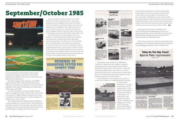 In this retrospective , we will examine historic issues of SportsTurf magazine , predecessor to SportsField Management magazine . In this issue , we start at the very beginning of the publication .
