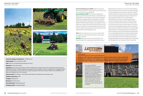 SportsField Management ( SFM ): What are you most proud of with FOY win , and / or what do you think stands out most about the winning field ? Bruce Suddeth , CSFM : I am most proud of the USC Upstate sports field crew , better known as # TheUCrew , for their hard work and resiliency to adversity . Achieving the SFMA FOY never gets old , and receiving this award feels like the first . The USC Upstate County University Soccer Stadium ( CUSS ) has gone through many upgrades and retrofits over the years , and continues to be a premium soccer pitch in our conference . It is always great to hear from our coaches , athletes and competitors when they express their appreciation for a great playing surface .