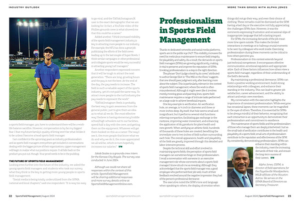 Thanks to dedicated networks and social media platforms , sports are in the public eye 24 / 7 . This visibility increases the need for meticulous maintenance to ensure field integrity for playability and safety . As a result , the demands on sports field managers ( SFMs ) are growing significantly , making it vital to preserve and improve the reputation of SFMs . Invoking professionalism is a step in the right direction .