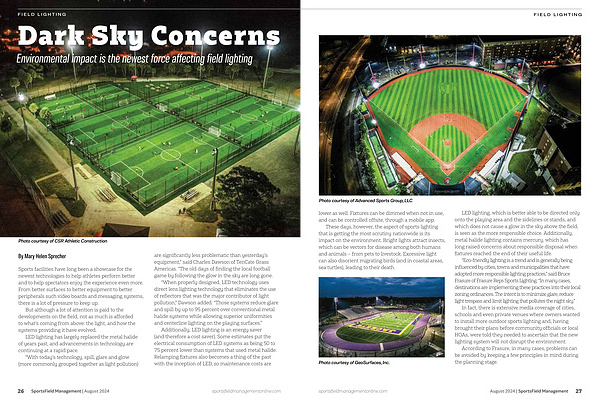 “ Eco-friendly lighting is a trend and is generally being influenced by cities , towns and municipalities that have adopted more responsible lighting practices ,” said Bruce Frasure of Frasure Reps Sports Lighting . “ In many cases , destinations are implementing these practices into their local zoning ordinances . The intent is to minimize glare , reduce light trespass and limit lighting that pollutes the night sky .”
