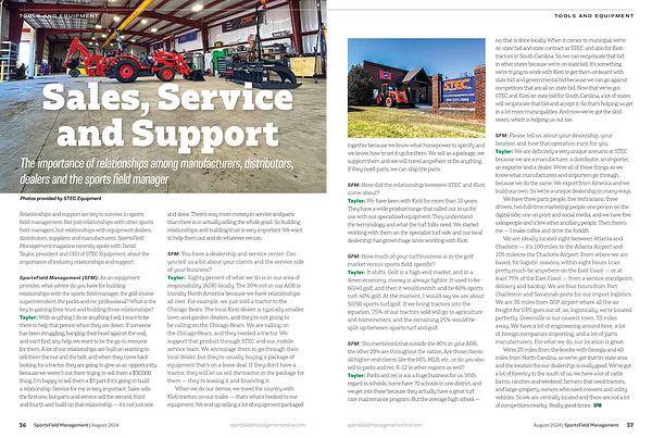 SportsField Management ( SFM ): As an equipment provider , what advice do you have for building relationships with the sports field manager , the golf course superintendent , the parks and rec professional ? What is the key to gaining their trust and building those relationships ? Taylor : With anything I do or anything I sell , I want to be there to help that person when they are down . If someone has been struggling , banging their head against the wall , and can ’ t find any help , we want to be the go-to resource for them . A lot of our relationships are built on wanting to sell them the nut and the bolt , and when they come back looking for a tractor , they are going to give us an opportunity , because we weren ’ t out there trying to sell them a $ 30,000 thing . I ’ m happy to sell them a $ 3 part if it ’ s going to build a relationship . Service for me is very important . Sales sells the first one , but parts and service sell the second , third and fourth and build on that relationship — it ’ s not just one