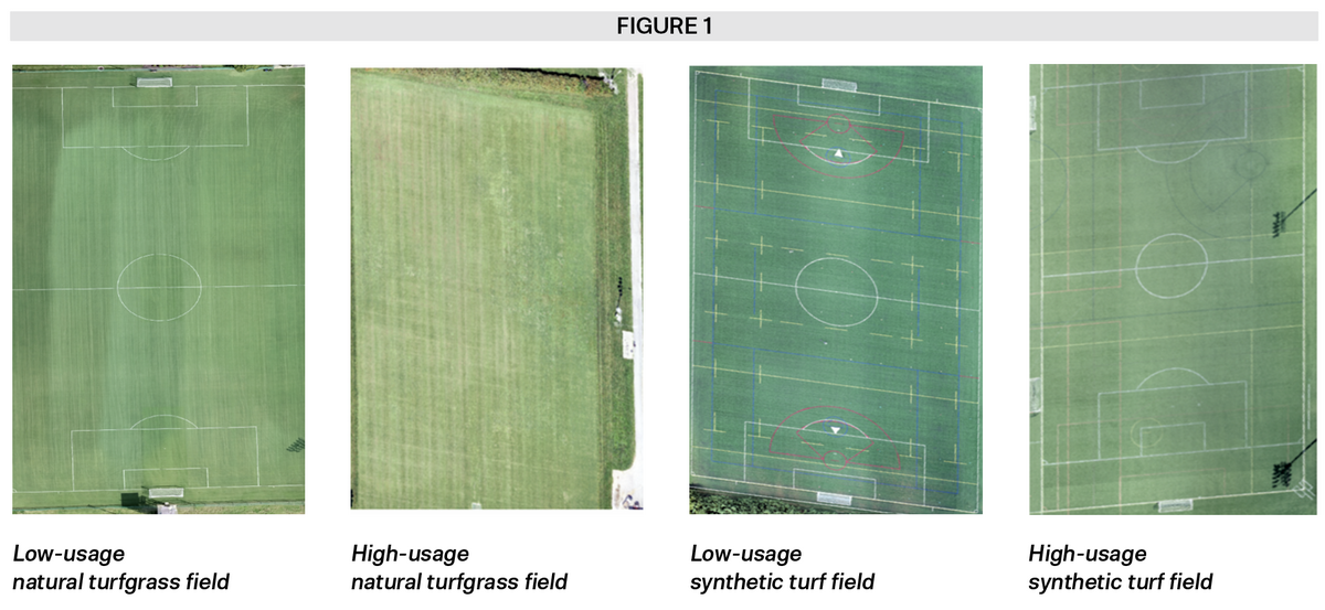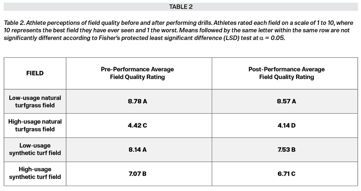 The low-usage natural turfgrass field received the highest quality rating on both pre- and post-performance surveys; while the highusage natural turfgrass field, hindered by weed encroachment and poor maintenance, scored the lowest. Synthetic turf fields ranked in between the two natural turfgrass fields, with the high- usage synthetic turf field rated lower than the low-usage synthetic turf field. These findings suggest a preference for synthetic surfaces over a poorly maintained natural turfgrass fields.