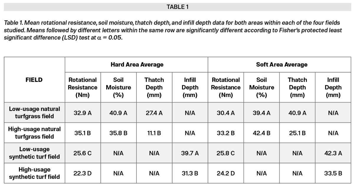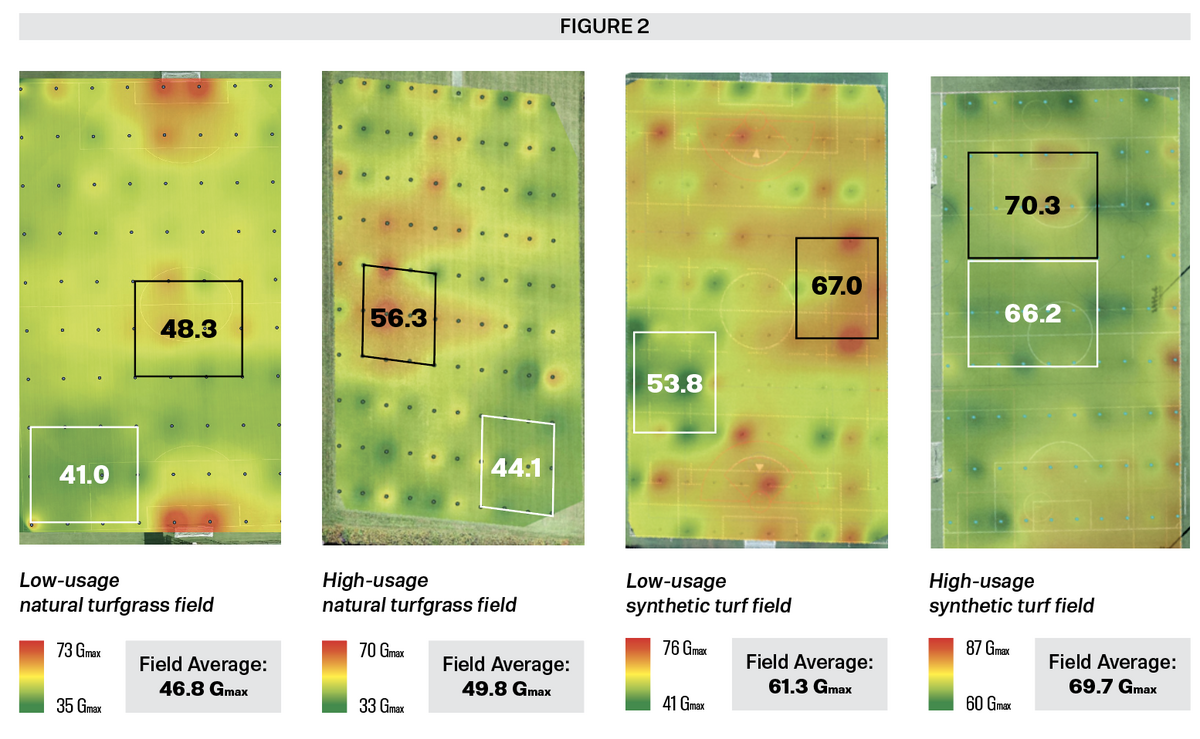 Considerable variation in surface hardness was observed both within and between fields, with synthetic turf fields generally being harder than natural turfgrass fields. High-usage fields, regardless of surface type, were significantly harder than lowusage fields. Other surface metrics — such as rotational resistance, soil moisture, thatch depth and infill depth — also showed variability. On natural turfgrass fields, higher soil moisture was associated with lower surface hardness. On synthetic turf fields, increased usage reduced infill depth, which in turn increased surface hardness.