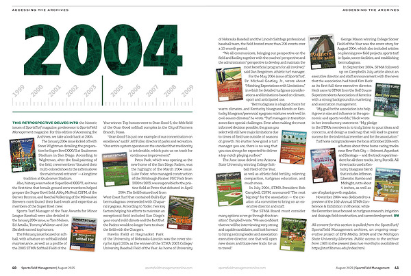 All content for this section is pulled from the SportsTurf / SportsField Management archives, an ongoing cooperative project of EPG Media, SFMA and the Michigan State University Libraries. Public access to the archive from 1985 to the present( less two months) is available at https:// sturf. lib. msu. edu / index. html. sportsfieldmanagementonline. com August 2025 | SportsField Management