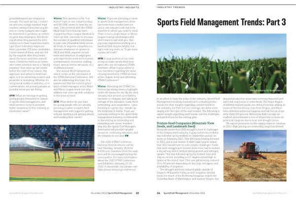Winter : Attending the STMA Conference has always been a highlight of the off-season for me . By the time January rolls around , your battery has been re-charged , and taking advantage of the education , trade show , networking , and camaraderie – plus traveling to a great city – breaks up the doldrums of winter . If you are currently working in the sports field management industry , or interested in discovering an interesting and rewarding new career , membership into the Sports Turf Managers Association will provide valuable resources , continuing education , and the initiative to succeed . SFM