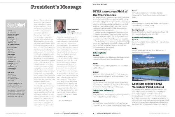 Nick McKenna , CSFM STMA President nmckenna @ athletics . tamu . edu sportsfieldmanagementonline . com December 2021 | SportsField Management