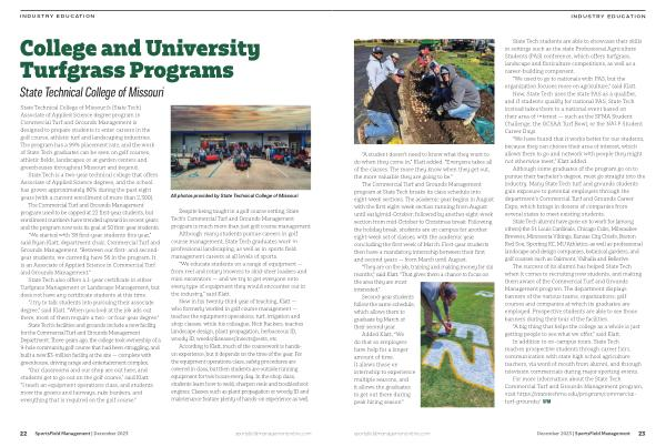 State Technical College of Missouri ’ s ( State Tech ) Associate of Applied Science degree program in Commercial Turf and Grounds Management is designed to prepare students to enter careers in the golf course , athletic turf and landscaping industries . The program has a 99 % placement rate , and the work of State Tech graduates can be seen on golf courses , athletic fields , landscapes or at garden centers and greenhouses throughout Missouri and beyond .