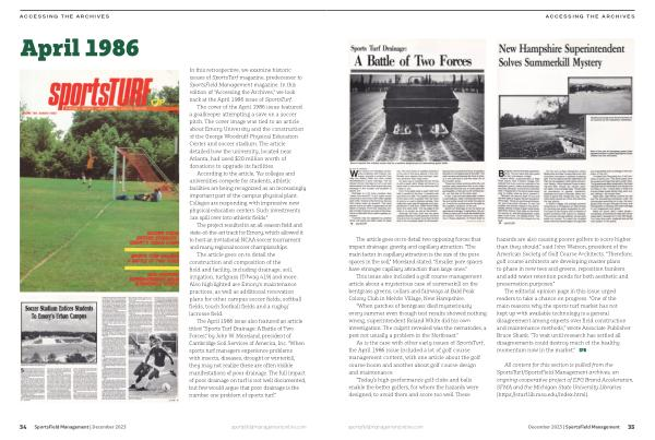 The April 1986 issue also featured an article titled “ Sports Turf Drainage : A Battle of Two Forces ,” by John W . Moreland , president of Cambridge Soil Services of America , Inc . “ When sports turf managers experience problems with insects , diseases , drought or winterkill , they may not realize these are often visible manifestations of poor drainage . The full impact of poor drainage on turf is not well documented , but few would argue that poor drainage is the number one problem of sports turf .”