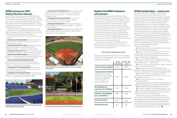 Make sure to renew your membership before the Dec . 31 year-end deadline to avoid missing out on these great benefits . Renew online by logging into your account and adding your membership to your cart through the Products page . Any questions about membership or how to renew can be directed to SFMA HQ at 800-323-3876 or sfmainfo @ sportsfieldmanagement . org . sportsfieldmanagementonline . com December 2023 | SportsField Management