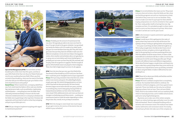Prince : I ’ m involved before the teams arrive . They want to know what we ’ ve done , what the fields are like , what our fertility programs are and our maintenance schedules before they come out to use our facilities . They want to make sure that it ’ s up to par for their athletes to play and practice on it . So I ’ m involved in that a good bit . Pace really prides itself on having this nice , big complex out here . It ’ s secluded enough to where teams want to come out here because it ’ s private . We ’ re here to make it as best as it can be year round .