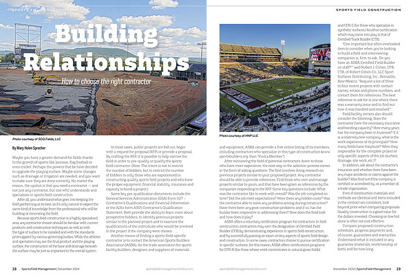 Another means of finding a sports-field-specific contractor is to contact the American Sports Builders Association ( ASBA ). As the trade association for sports facility builders , designers and suppliers of materials