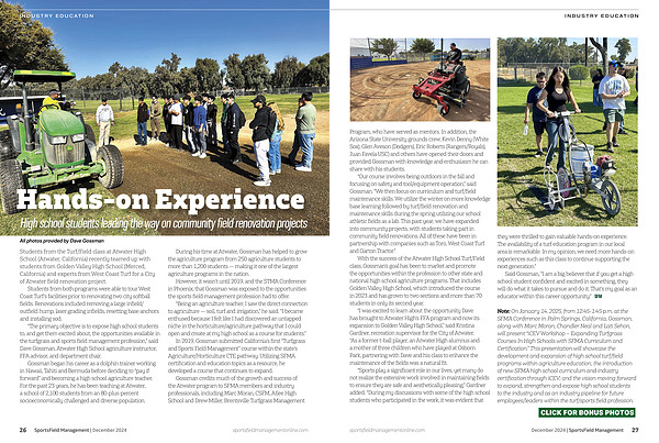 Note : On January 14 , 2025 , from 12:45-1:45 p . m . at the SFMA Conference in Palm Springs , California , Gossman , along with Marc Moran , Chandler Neal and Lati Sehon , will present “ iCEV Workshop – Expanding Turfgrass Courses In High Schools with SFMA Curriculum and Certification .” This presentation will showcase the development and expansion of high school turf / field programs within agriculture education ; the introduction of new SFMA high school curriculum and industry certification through iCEV ; and the vision moving forward to expand , strengthen and expose high school students to the industry and as an industry pipeline for future employees / leaders within the turf / sports field profession . sportsfieldmanagementonline . com December 2024 | SportsField Management