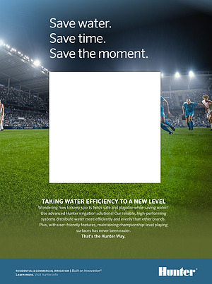 TAKING WATER EFFICIENCY TO A NEW LEVEL Wondering how to keep sports fields safe and playable while saving water ? Use advanced Hunter irrigation solutions ! Our reliable , high-performing systems distribute water more efficiently and evenly than other brands . Plus , with user-friendly features , maintaining championship-level playing surfaces has never been easier . That ’ s the Hunter Way .