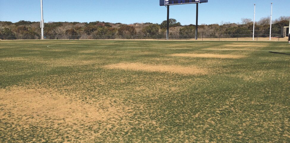result of training. This field, located in the south central United States has a 419 bermudagrass base that is overseeded with ryegrass in the winter to allow green grass for practices and games. This particular college coach used to like to run practice drills on the same area of the field. Despite requests from the sports field manager to move the drills around, the coach kept the drills in the same areas. It seems that as you move down the age groups or levels of play, professional level coaches almost always move around their drills, college and university coaches sometimes move around their drills, and high school coaches seldom move the players around on the field. Despite the increased wear to these areas, the sports field manager did a good job, applying additional overseeding as needed and keeping the overseeded ryegrass growing through the winter. When the ryegrass transitioned out, you can clearly see the rectangular wear areas that were totally void of bermudagrass.