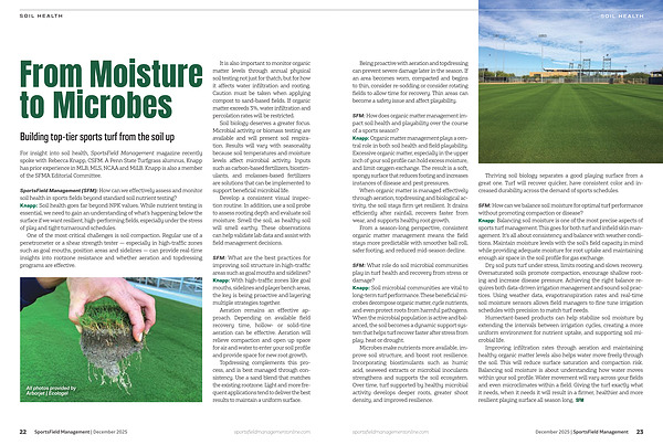 SFM: What role do soil microbial communities play in turf health and recovery from stress or damage? Knapp: Soil microbial communities are vital to long-term turf performance. These beneficial microbes decompose organic matter, cycle nutrients, and even protect roots from harmful pathogens. When the microbial population is active and balanced, the soil becomes a dynamic support system that helps turf recover faster after stress from play, heat or drought.