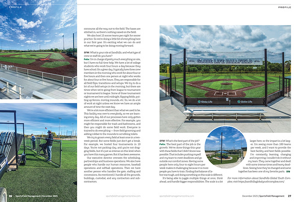 SFM: What’ s the best part of the job? Felix: The best part of the job is the growth. We’ ve done things this year with these fields that I didn’ t know was possible. That includes pushing myself and my team to meet deadlines and go outside our comfort zones. Having some people here only four to eight hours per week makes it challenging because it is more people you have to train. Finding that balance of labor was tough, and doing something on this scale is different.