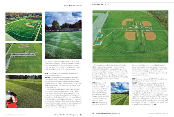 SFM : What does winning the SFMA Mowing Patterns Contest mean to you and your crew ? MILLER : Winning this contest is such an honor . I believe it really demonstrates the dedication and passion we have for maintaining these fields for the community . When I started in this position in 2018 , it was my goal to provide the safest and most enjoyable playing fields possible . We have been diligently working toward that goal , and I am very grateful for the support we are given from everyone to help achieve our success . Growing up in Aurora and now raising my own family here , there is nothing more rewarding than watching my two girls and our family and friends play on the fields I maintain each day . SFM