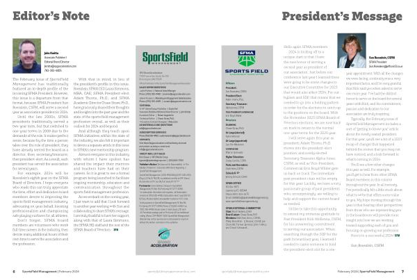 Sun Roesslein , CSFM SFMA President Sun . Roesslein @ jeffco . k12 . co . us sportsfieldmanagementonline . com February 2024 | SportsField Management