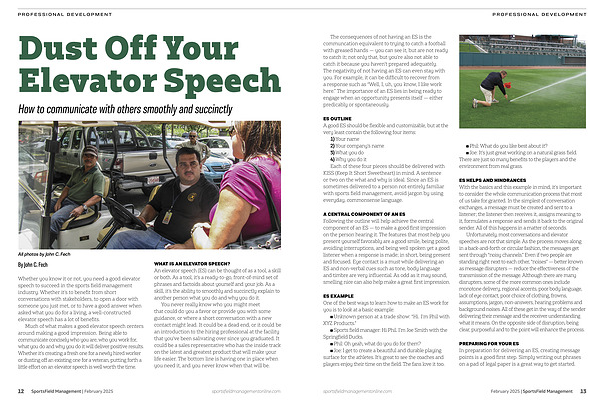 Whether you know it or not , you need a good elevator speech to succeed in the sports field management industry . Whether it ’ s to benefit from short conversations with stakeholders , to open a door with someone you just met , or to have a good answer when asked what you do for a living , a well-constructed elevator speech has a lot of benefits .