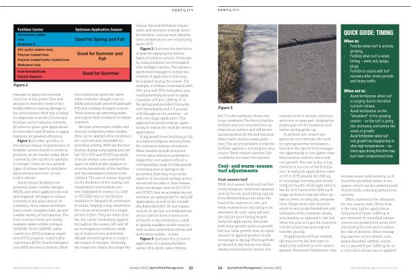 Figure 2 illustrates the best times of year for applying the various types of nutrient carriers . Fortunately , many fertilizers are formulated with multiple carriers . This allows a sports field manager to reduce the number of applications that may be required during the season . For example , a fertilizer formulated with 25 % urea and 75 % methylene urea could potentially be used to apply 2 pounds of N per 1,000 sq . ft . in the spring and provide 0.5 pounds of N immediately and 1.5 pounds of N throughout the summer – all with one single application . This approach would provide an opportunity to reduce the need for several applications .