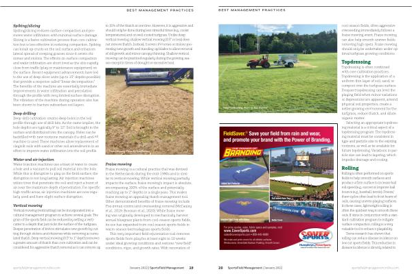 This very important field rejuvenation tool removes sports fields from play for at least eight to 10 weeks under ideal growing conditions and restores “ new field ” conditions , vigor , and growth rates . With renovation of sportsfieldmanagementonline . com January 2022 | SportsField Management