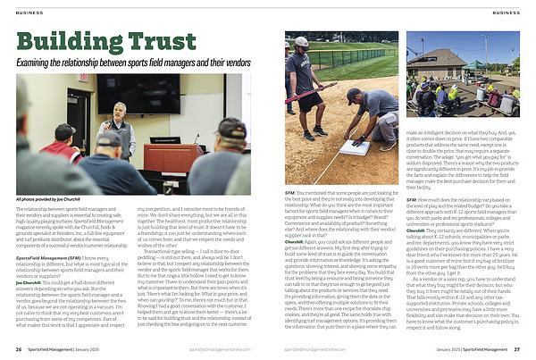SFM : You mentioned that some people are just looking for the best price and they ’ re not really into developing that relationship . What do you think are the most important factors for sports field managers when it comes to their equipment and supplies needs ? Is it budget ? Brand ? Convenience and availability of product ? Something else ? And where does the relationship with their vendor / supplier rank in that ? Churchill : Again , you could ask six different people and get six different answers . My first step after trying to build some level of trust is to guide the conversation and provide information or knowledge . It ’ s asking the questions , showing interest , and showing some empathy for the problems that they face every day . You build that trust level by being a resource and being someone they can talk to or that they trust enough to go beyond just talking about the products or services that they need . It ’ s providing information , giving them the data or the specs , and then offering multiple solutions to fit their needs . There ’ s more than one recipe for chocolate chip cookies , and they ’ re all good . The same holds true with identifying turf management options . It ’ s providing them the information that puts them in a place where they can make an intelligent decision on what they buy . And , yes , it often comes down to price . If I have two comparable products that address the same need , except one is close to double the price , that may require a separate conversation . The adage , “ you get what you pay for ” is seldom disproved . There ’ s a reason why the two products are significantly different in price . It ’ s my job to provide the facts and explain the differences to help the field manager make the best purchase decision for them and their facility .