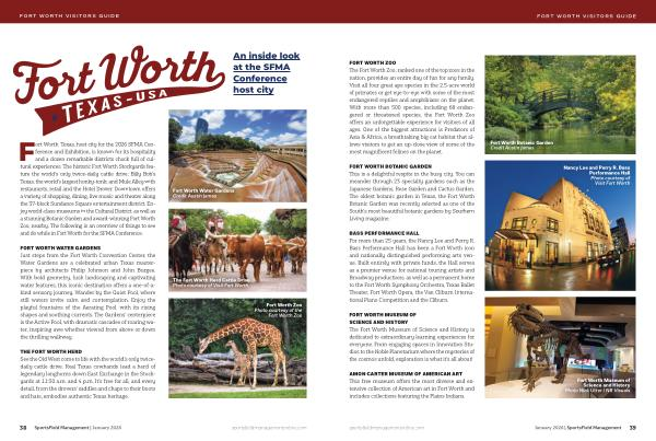 Fort Worth, Texas, host city for the 2026 SFMA Conference and Exhibition, is known for its hospitality and a dozen remarkable districts chock full of cultural experiences. The historic Fort Worth Stockyards feature the world’ s only twice-daily cattle drive; Billy Bob’ s Texas, the world’ s largest honky-tonk; and Mule Alley with restaurants, retail and the Hotel Drover. Downtown offers a variety of shopping, dining, live music and theater along the 37-block Sundance Square entertainment district. Enjoy world-class museums in the Cultural District, as well as a stunning Botanic Garden and award-winning Fort Worth Zoo, nearby. The following is an overview of things to see and do while in Fort Worth for the SFMA Conference.