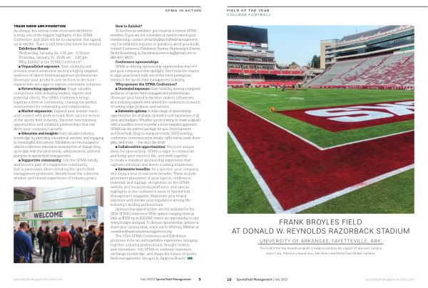 The 2024 SFMA Conference and Exhibition promises to be an unforgettable experience , bringing together industry professionals , thought leaders and innovators . Join SFMA to celebrate members , exchange knowledge , and shape the future of sports field management . See you in Daytona Beach ! sportsfieldmanagementonline . com July 2023 | SportsField Management