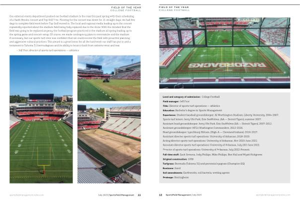 Level and category of submission : College Football Field manager : Jeff Foor Title : Director of sports turf operations — athletics Education : Bachelor ’ s degree in Sports Management Experience : Student baseball groundskeeper : Al Worthington Stadium , Liberty University , 2004-2007 . Sports turf intern : Jerry Uht Park , Erie SeaWolves , ( AA — Detroit Tigers ), summer 2007 . Assistant head groundskeeper : Jerry Uht Park , Erie SeaWolves ( AA — Detroit Tigers ), 2007-2012 . Assistant groundskeeper : NFL ’ s Washington Commanders , 2012-2016 . Head groundskeeper : Lynchburg Hillcats , ( High-A — Cleveland Indians ), 2016-2017 . Assistant director sports turf operations : University of Arkansas , 2018-2020 . Acting director sports turf operations : University of Arkansas , Nov 2020-June 2021 . Associate director sports turf operations : University of Arkansas , July 202-June 2022 . Director of sports turf operations : University of Arkansas , July 2022-Present . Full-time staff : Zach Severns , Jody Phillips , Mike Phillips , Ben Hall and Wyatt Holtgrewe Original construction : 1938 Turfgrass : Bermuda ( Tahoma 31 ) and perennial ryegrass ( Champion GQ ) Rootzone : Sand Soil amendments : Earthworks , soil bacteria , wetting agents Drainage : Herringbone