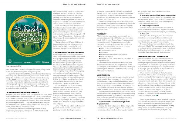 A PICTURE IS WORTH A THOUSAND WORDS NRPA complements its chosen theme with an annual Park and Recreation Month Cover Contest . Each year , park and recreation agencies submit their photos that they believe best illustrate the theme with the goal of being featured on the July cover of Parks & Recreation magazine . This year , City of Glenwood Springs ( Colorado ) Parks and Recreation earned bragging rights with its inspiring image of Isaac Alonso , a young community member who participates in the agency ’ s therapeutic recreation program . What ’ s more , Glenwood Springs Parks and Recreation ’ s Helaine “ Laine ” Fabijanic and the Alonso family were profiled in the cover story by Cort Jones , NRPA ’ s senior manager of digital content .