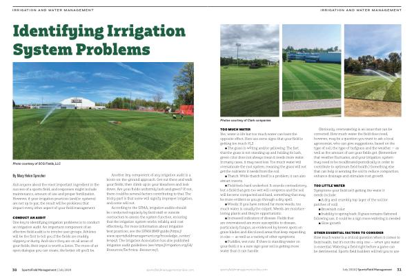 CONDUCT AN AUDIT One key to identifying irrigation problems is to conduct an irrigation audit . An important component of an effective field audit is to involve user groups . Athletes will be the first to tell you if the fields are muddy , slippery or dusty . And since they are on all areas of your fields , their input is worth a listen . The more of an open dialogue you can create , the better off you ’ ll be .