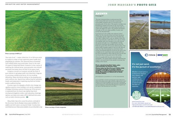 If you would like to submit a photograph for John Mascaro ’ s Photo Quiz , please send a high-resolution digital photo to John Mascaro via email at john @ turf-tec . com . If your photograph is selected , you will receive full credit . All photos submitted will become property of SportsField Management magazine and the Sports Field Management Association .