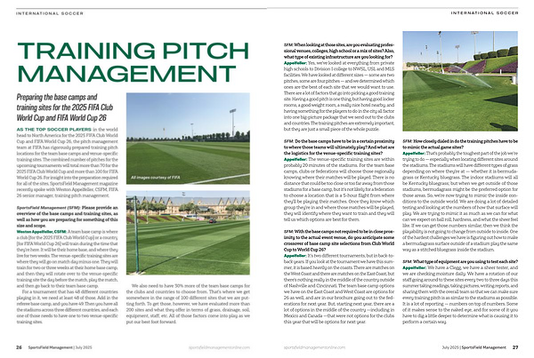 SFM: What type of equipment are you using to test each site? Appelfeller: We have a Clegg, we have a sheer tester, and we are checking moisture daily. We have a rotation of our staff going around to these sites every two to three days this summer taking readings, taking pictures, writing reports, and sharing them with the overall team so that we can make sure every training pitch is as similar to the stadiums as possible. It is a lot of reporting— numbers on top of numbers. Some of it makes sense to the naked eye, and for some of it you have to dig a little deeper to determine what is causing it to perform a certain way. sportsfieldmanagementonline. com July 2025 | SportsField Management