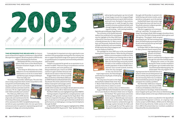 All content for this section is pulled from the SportsTurf / SportsField Management archives, an ongoing cooperative project of EPG Media, SFMA and the Michigan State University Libraries. Public access to the archive from 1985 to the present( less two months) is available at https:// sturf. lib. msu. edu / index. html. sportsfieldmanagementonline. com July 2025 | SportsField Management