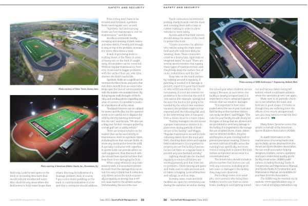 “ Facility managers should ensure a proper maintenance routine is in place even during periods of limited use of the facility ,” said Wiggin . “ Regular maintenance should include collecting debris from the track and field , checking drain inlets and regular field maintenance . It is important to properly secure the facility if personnel are not there on a regular basis to prevent any unscheduled activity .”