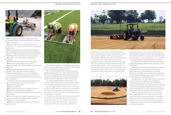 “ It ’ s easier to make smart decisions based on input from your much smaller group ,” he said . “ Usually , that group is limited to you , a coach or two and one or more experienced professionals in design and construction . There are many owners who have to sportsfieldmanagementonline . com June 2023 | SportsField Management