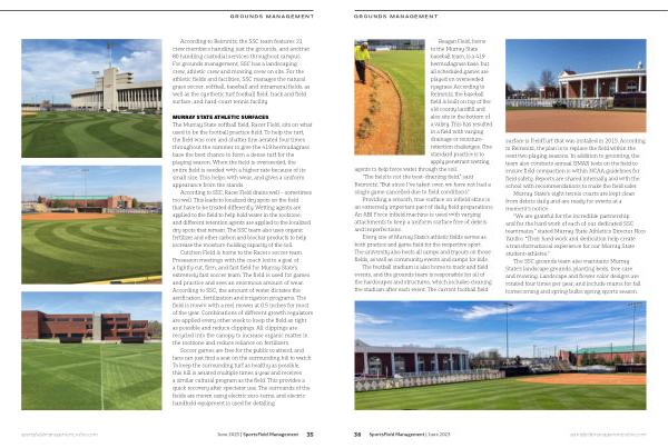 Soccer games are free for the public to attend , and fans can just find a seat on the surrounding hill to watch . To keep the surrounding turf as healthy as possible , this hill is aerated multiple times a year and receives a similar cultural program as the field . This provides a quick recovery after spectator use . The surrounds of the fields are mown using electric zero-turns , and electric handheld equipment is used for detailing . sportsfieldmanagementonline . com June 2023 | SportsField Management