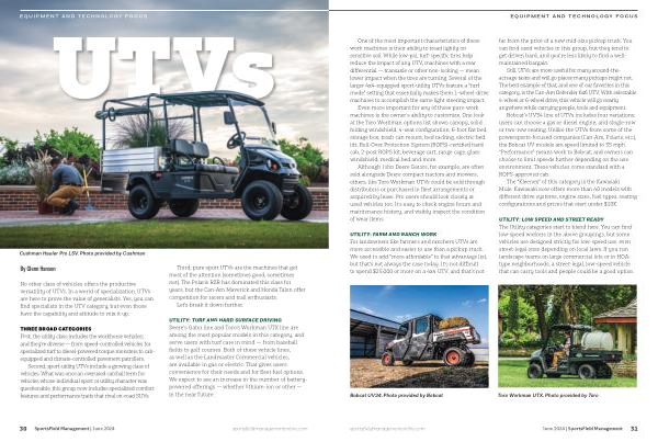 UTILITY : TURF AND HARD SURFACE DRIVING Deere ’ s Gator line and Toro ’ s Workman UTX line are among the most popular models in this category , and serve users with turf care in mind — from baseball fields to golf courses . Both of these vehicle lines , as well as the Landmaster Commercial vehicles , are available in gas or electric . That gives users convenience for their needs and for fleet fuel options . We expect to see an increase in the number of batterypowered offerings — whether lithium-ion or other — in the near future .