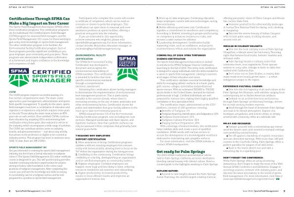 DON ’ T FORGET THE CONFERENCE : While Palm Springs offers an array of enticing distractions , don ’ t forget to make the most of the 36th Annual SFMA Conference and Exhibition . Engage in enriching sessions , network with industry peers , and discover the latest innovations in the world of sports field management . For more information , visit https :// www . sportsfieldmanagement . org / conference / sportsfieldmanagementonline . com June 2024 | SportsField Management