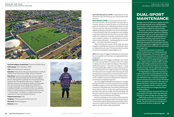 SportsField Management( SFM): Congratulations on the Field of the Year win. What are you most proud of with this win? Steve Hamilton, CSFM: I’ m most proud of our team— from top to bottom. We haven’ t built a new park here in Surprise, Arizona, in nearly 20 years; so to see that old gravel lot transform into a vibrant green field was truly a dream come true. This project brought our team closer together, building trust along the way, as we worked handin-hand to bring it to life. Our management was incredibly supportive and listened to every concern we had, which made all the difference. Honestly, receiving this award was a complete surprise to us, and it brings so much joy to know that youth sports— including games for my own kids— now have these fields to play on.