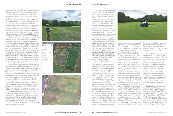 We are collaborating with a group of scientists throughout the country to develop additional uses and to further fine-tune successful options for precision turfgrass management . The technology is there , but the current process is far from perfect at this time . There are overestimations and underestimations of where a computer “ thinks ” there are pests . The integration from one system to another isn ’ t flawless yet . A few choice words have been said in the heat of battle with the equipment , but we typically still come out as friends at the end of the day . And in keeping with the bottom dollar , the waypoint navigation , stitching and GIS software are all open-access and / or free . Our goal is to provide opensource computer codes that can become plug-and-play as mapping and GPS sprayer technologies continue to evolve . Costs can be quite low and the recipes will be written . Budgets are tight these days , so isn ’ t this the type of strategy worth investigating a little more on your end ?