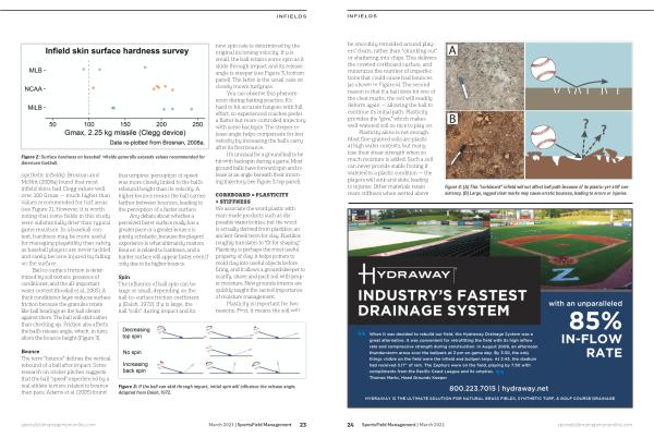 synthetic infields ). Brosnan and McNitt ( 2008a ) found that most infield skins had Clegg values well over 100 Gmax — much higher than values recommended for turf areas ( see Figure 2 ). However , it is worth noting that some fields in this study were substantially drier than typical game moisture . In a baseball context , hardness may be more useful for managing playability than safety , as baseball players are never tackled and rarely become injured by falling on the surface .