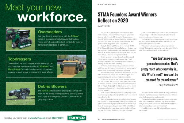 The Sports Turf Managers Association ( STMA ) 2020 Founders Awards winners were recognized for their contributions to STMA and to the profession . SportsField Management recently spoke with the 2020 honorees about the challenges of the past year and sports field management amid a pandemic .
