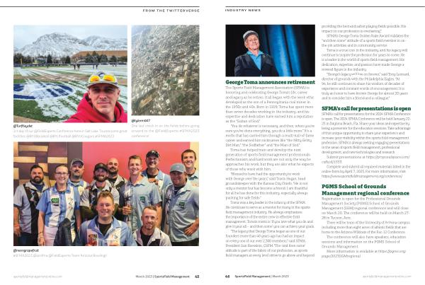 “ The legacy that George Toma began as one of our founders more than 40 years ago has had an impact on every one of our over 2,300 members ,” said SFMA President Sun Roesslein , CSFM . “ The ‘ and then some ’ attitude is part of the fabric of our profession , as sports field managers at every level strive to go above and beyond