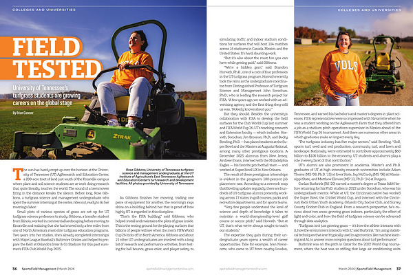 But they should. Besides the university’s collaboration with FIFA to develop the field surfaces for the Club World Cup last summer and FIFA World Cup 26, UT’s teaching, research and Extension faculty — which includes Horvath, Sorochan, Jim Brosnan, Ph.D., and Becky Bowling, Ph.D. — has placed students at the Super Bowl and the Masters at Augusta National, among many other prestigious locations. A December 2025 alumnus from New Jersey, Andrew Evans, interned with the Philadelphia Eagles — his favorite pro football team — and worked at Super Bowl LIX in New Orleans.