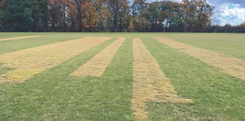 These lines across the center of this multipurpose field appeared in the fall, about four months after this field was constructed. When the field was installed, 12 inches of a 12-inch-deep sandy loam soil rootzone was installed and then the field was sodded with large roll hybrid bermudagrass. The contract specified the turf for the install to be a particular variety of bermudagrass. After it was installed, the athletic field design and construction manager noticed a difference in the leaf texture on seven or eight rolls in the middle of the field, as some of the turf appeared to have finer leaf blades. This photo was taken on October 30, right after the first cold snap of the season for this area. As you can see, the finer-textured bermudagrass turf began showing signs of dormancy while the rest of the field held a solid green color. As it turned out, a few rolls of the finer textured turf were mixed in with the specified turf when it was installed. The athletic field design and construction manager is taking this all in stride and looking forward to seeing how the different varieties will come out of dormancy and perform next year.