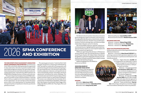 2026 SFMA BOARD OF DIRECTORS TAKES OFFICE The 2026 Sports Field Management Association( SFMA) Board of Directors took office during the association’ s Annual Meeting held during the conference. The 2026 SFMA Board of Directors is as follows: