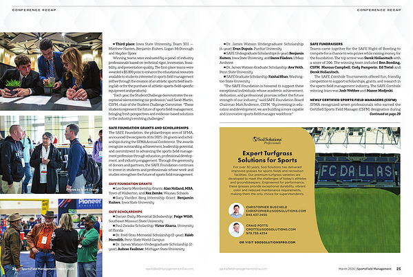 “ The SAFE Foundation is honored to support these exceptional individuals whose academic achievement, dedication, and professional promise reflect the future strength of our industry,” said SAFE Foundation Board Chairman Matt Anderson, CSFM.“ By investing in education and development, we are building a more capable and innovative sports field manager workforce.”