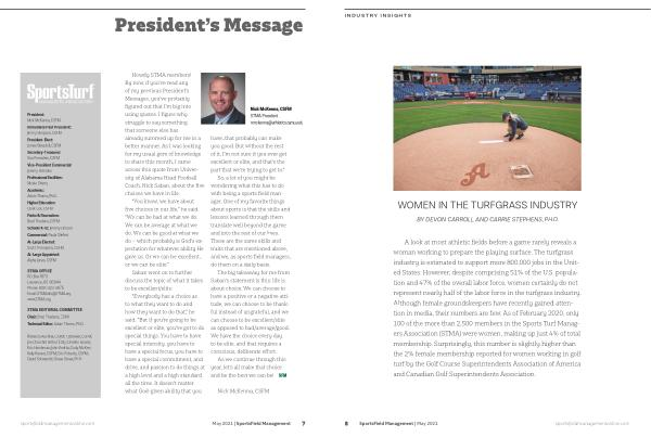 Nick McKenna , CSFM STMA President nmckenna @ athletics . tamu . edu sportsfieldmanagementonline . com May 2021 | SportsField Management